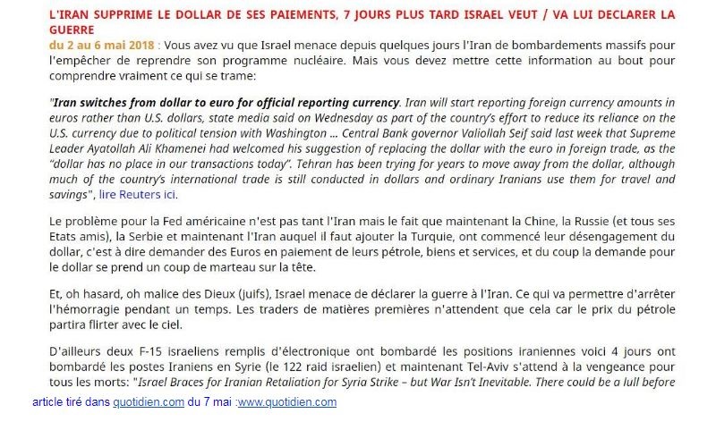 L'actualité nous rattrape , l'Iran a décidé d'abandonner le dollar pour le paiement de son pétrole :