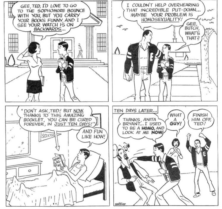 elle vend une méthode : "HOMO NO MO -MACHO BUILDING COURSE", je traduis : " Homo stop - cours de maintien macho ". Si vous connaissez un militant LGBT demandez lui d'être attentif et d'écouter seulement voilà ce qu'on en disait en 1970 .