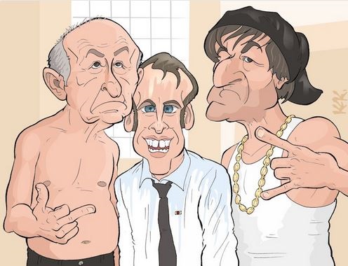 -Tiens il arrive , le jeune banquier avec sa Brigitte , tu sais qu'ils voulaient me foutre a roupiller à coté de Simone Veil . C'est vrai que la république est en panne, ils n'ont plus personne à foutre dans ce sanctuaire , comme disait Gainsbourg la chanson est un art mineur , j'ai dit à Ulla, mon épouse, si on te le propose de me foutre au Panthéon , tu refuses catégoriquement ! Pourquoi pas y mettre Wolinski ou le Professeur Choron ? Non ! Hugo, Zola, Dumas, Jean Moulin ont leur place mais nous on arrive pas a leur cheville , même Le Finckelkraut il se voit déjà a faire des bulles à côté de Malraux, tout ce qu'il sait faire c'est se plaindre , ce jeune scribouillard !