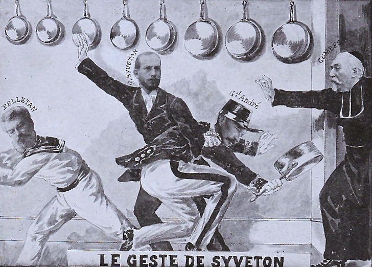 Le 4 novembre 1904, le général André, Ministre de la Guerre dans le Gouvernement d'Émile Combes, est giflé à la Chambre par le député nationaliste du IIIème arrondissement de Paris, Gabriel Syveton. Cet incident survient à la suite de la publication par la presse de droite de l’"affaire des fiches": le général André avait fait rédiger des fiches de renseignements sur les opinions religieuses des officiers de l’armée dans le but d’empêcher les officiers catholiques et conservateurs de progresser. L'incident porte à son paroxysme le conflit entre le Gouvernement républicain en place depuis les élections de 1902 et l'Église.