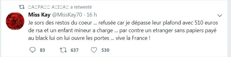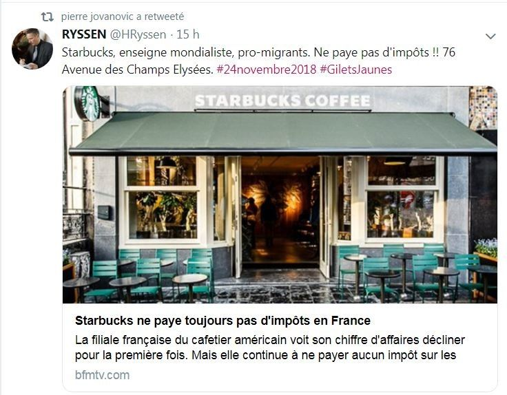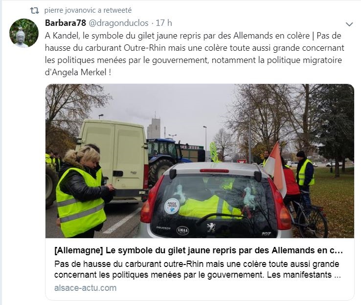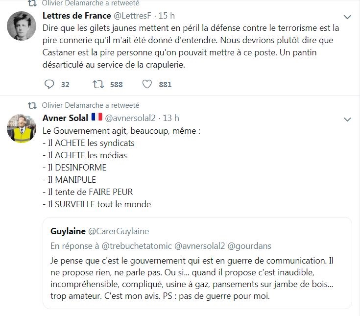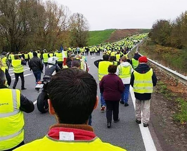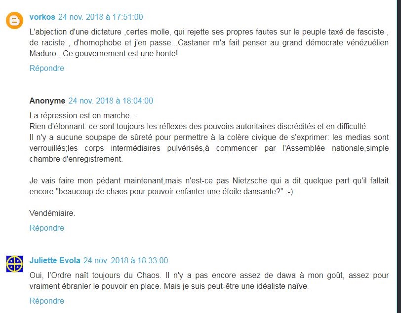 LES SYNDICATS ONT BIEN TRAHI LE PEUPLE FRANCAIS (CHOSES ENTENDUES SUR LES CHAMPS ELYSEES) du 19 au 23 novembre 2018 : Pour la première fois des Français qui ne sont jamais allés manifester pour quoi que ce soit ont décidé de rejoindre le mouvement, une véritable première en France. Notez qu'en aucune façon les Gilets Jaunes sont comparables à ceux qui sont descendus contre le Mariage pour tous. Samedi, j'ai vu les Français de tous les jours, non engagés politiquement qui sont venus manifester leur ras le bol, car c'est bien de cela qu'il s'agit. Toutes ces taxes menacent littéralement leur survie, sans parler du "déclassement économique" dont ils sont les victimes. J'ai pu discuter avec une vingtaine de manifestants, et parmi eux j'y ai même découvert deux banquiers (dont un trader en salle des marchés). Ouvriers, techniciens, agents de maîtrise, logisticiens, chauffeurs livreurs, cadres, professions libérales, agents de la SNCF, fonctionnaires, ils étaient tous là. Sauf qu'ils tranchaient totalement avec les manifestants de la CGT et CFDT et FO qu'on voit habituellement dans les défilés organisés. Ceux-là étaient différents dans le sens ou personne n'avait de badge de syndicat, et s'exprimaient avec calme, sans aucun discours ou arguments préparés. Un autre monde, celui de la France qu'on pourrait appeler de "silencieuse", mais qui a décidé de ne plus le rester. Et justement c'est cela qui devrait inquiéter le gouvernement Macron. Que ceux qui ne disent rien tout à coup commencent à hurler avec les loups. Clairement, les énarques de l'Elysée et de Bercy ne les ont pas vu venir. Pire, les syndicats comme la CFDT ont carrément demandé à leurs encartés de ne pas y aller.... Une colère ne peut qu'être syndiquée, évitant par là de voir que leur base leur échappe de plus en plus. Les insultes ont plu depuis quelque jours contre cette France qui travaille: "poujadistes", "bouseux", etc., etc. Mëme Bernard-Henri Levy, le millionnaire philosophe qui n'a pas de souci de porte-monnaie pour faire le plein, les a traités de poujadistes et a demandé à BFM de ne pas couvrir leur manifestation. Incroyable!!! Les riches décident de ce que les sens dents auront comme info, vous en avez une nouvelle preuve. Vous pouvez également voir ce que les responsables d'En Marche pensent des manifestants en jaune: des abrutis. Super... La guerre civile et la révolution ne sont vraiment plus très loin.