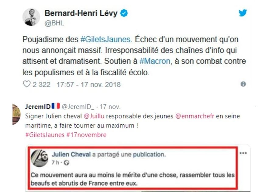 Vous pouvez le constater mieux aujourd'hui que chacun a marqué son camps, tu es l'un ou l'autre, y a pas de milieu. Les Bobos disent : "vous les médias , arrêtez de donner de l'importance aux gilets jaunes, vous attisez la haine et leur donnez une importance qui n'existe pas "Ils disaient déjà la même chose sur JM Lepen ou Zemmour .
