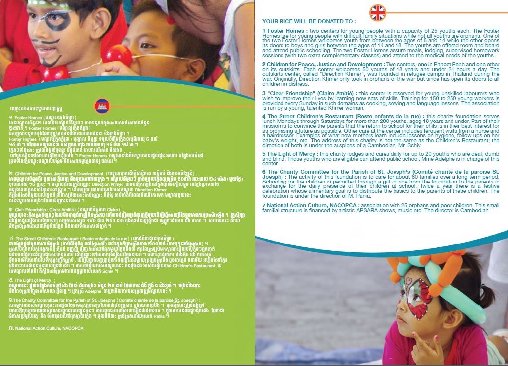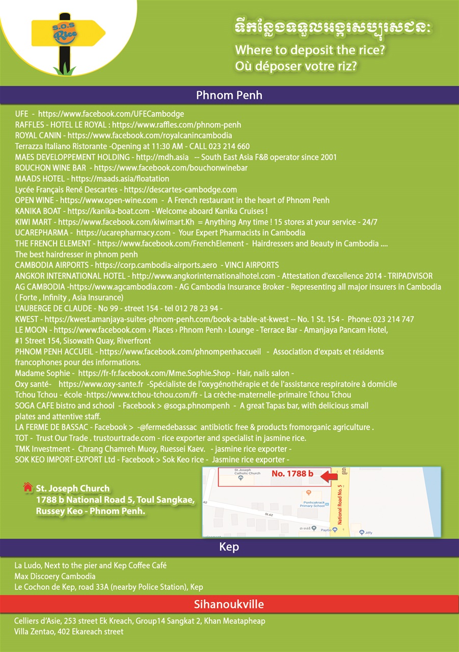 -B- RIZ 1 kg : dépôt - vente - dans les differents commerces de Phnom Penh . -C- VINS , en 2016 et 2017 , les Celliers d'Asie avaient sorti un vin en promotion "SOS RICE " ou 5$ par bouteille étaient inclus dans le prix pour notre action (voir Maxime ). - Phnom Penh -Battambang et Sihanoukville .