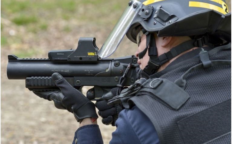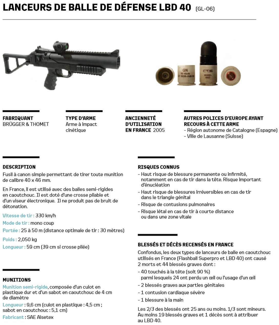 Les policiers utilisent deux lanceurs de balles de défense (LBD), dits aussi "gomme cogne", tirant des munitions "non létales" (caoutchouc ou mousse) lors des manifestations violentes : le LBD40 pour les distances supérieures à 20 mètres et le "Flash-Ball" pour les distances courtes.