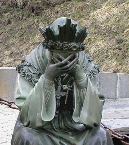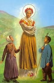 La Sainte Vierge à la Salette (38), pleurant sur le sort des français , ici telle qu'elle est apparue aux deux jeunes salettus le 19 septembre 1846 .