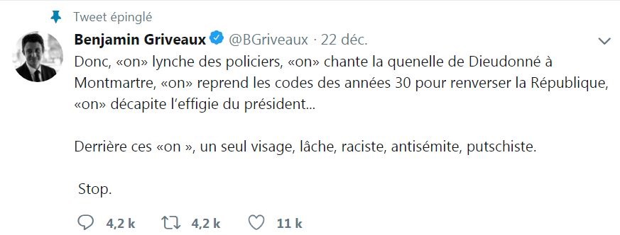 Hier soir, deux jeunes gilets jaunes chantaient la chanson de la Quenelle de Dieudonné dans le métro, assise un peu plus loin une vieille dame s'indigne et dit : "Par respect pour mes parents morts dans les camps, taisez -vous ..."