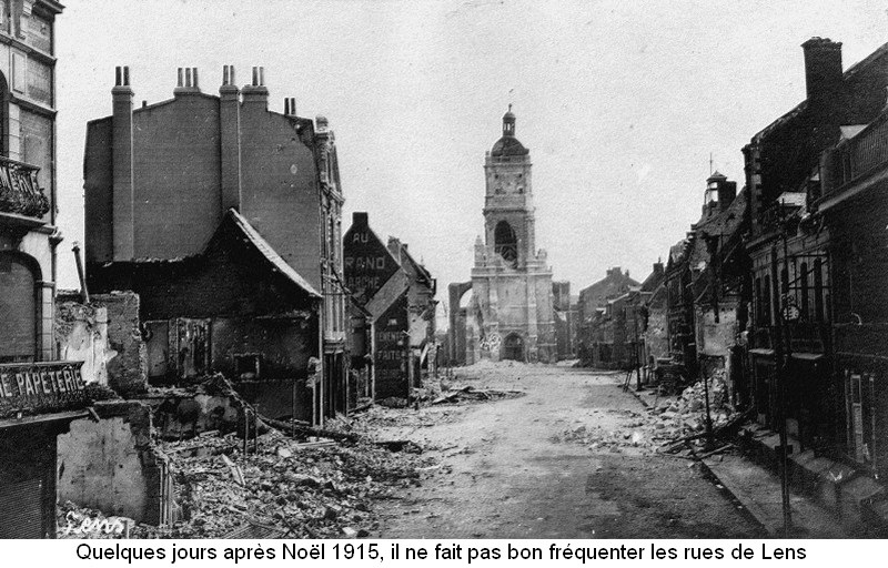 Les troupes anglaises tirent de Calonne. Ils utilisent des obus à balles, des « shrapnel », qui en explosant envoient une multitude de projectiles sur l’objectif. De Loos, arrivent des obus énormes dont un seul peut écraser une maison entière. Il en tombe principalement entre le boulevard des Ecoles (boulevard Basly) et la mairie. Les grandes écoles ne sont plus que ruines.