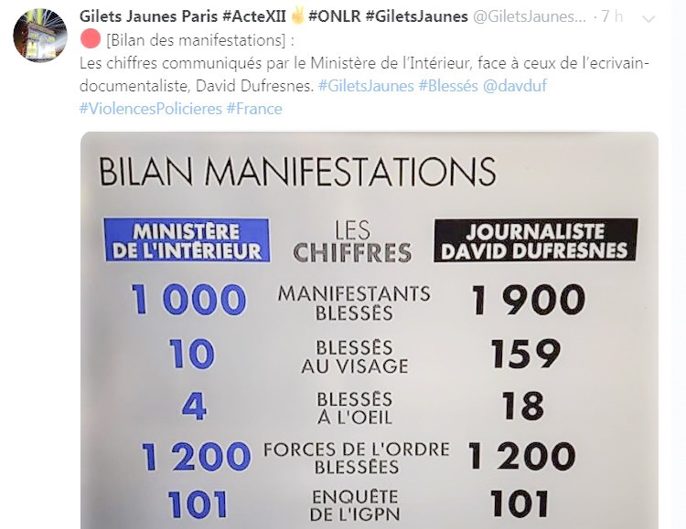 Jamais un mouvement social n'avait connu un bilan aussi lourd et disproportionné sous la 5e république. Pour le gouvernement, il ne s'agit plus de maintient de l'ordre mais de maintient au pouvoir. #ActeIX #acte9 #giletsjaunes #12janvier #12janvier2019