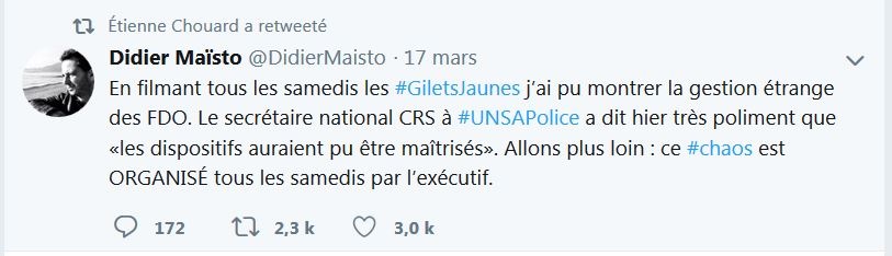 Le 19 mars à 01:58 par Szczebrzerzyszczykowski Édouard Philippe remplace le préfet de police de Paris et interdit les (...) Apparemment quelqu’un dans la police (le préfet viré ?) aurait pris sur lui d’avoir changé les munitions des LBD pour cet acte (XVIII) en confisquant les munitions puissantes (portée 40 m) et en distribuant des munitions "faibles" (9 m). Je viens de voir Castaner sur LCI face à Pujadas, furieux contre cette mesure, annonçant que c’était une "faute". Donc, le samedi prochain, on repasse au 40 mètres (il l’a dit avec une délectation certaine). Gare à vos mirettes !