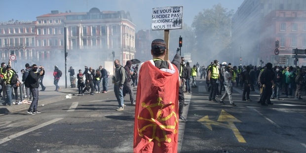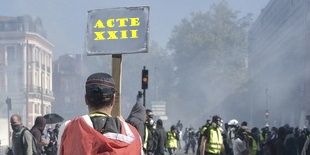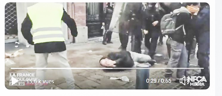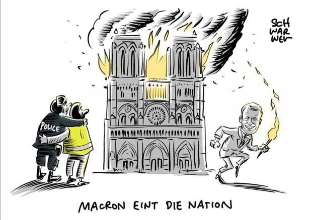 Plus Depuis l'Allemagne comment voit on cela: Un Gilet Jaune et un Crs s'étreignent et macron s'échappe comme un diable avec la torche qui lui a permis d'allumer l'incendie de Notre-Dame. En légende : "MACRON UNIT LA NATION" - Dans les journaux Russes l'analyse est identique…