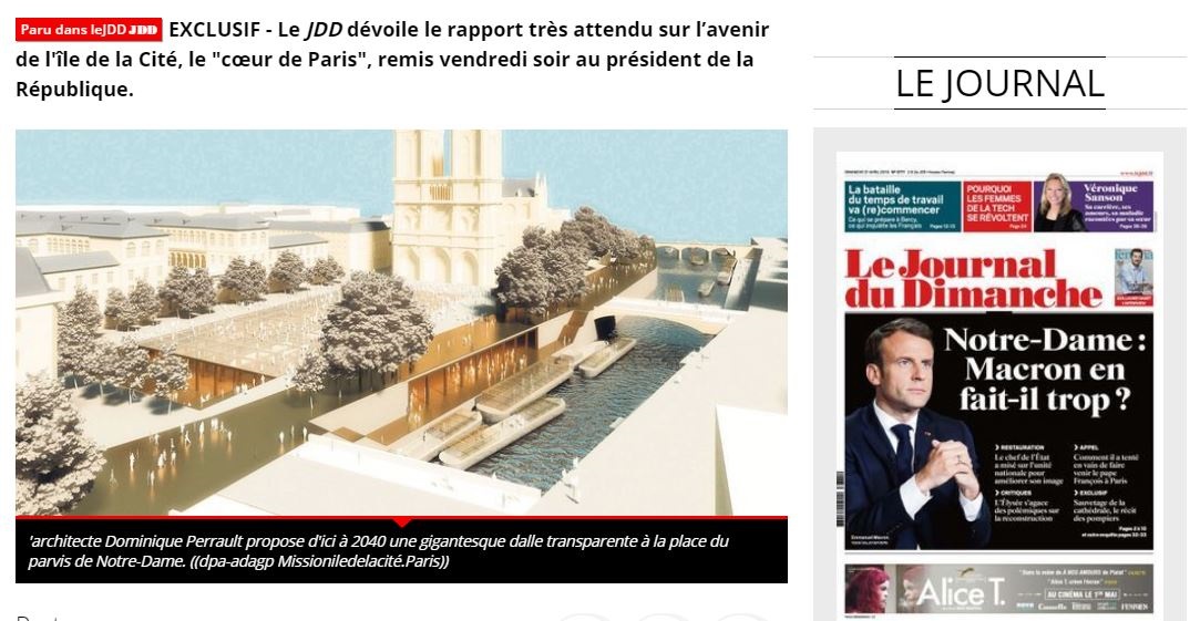 « Hidalgo a vendu le parvis de Notre Dame à Auchan et Unibail. […] Des réunions ont été organisées, des maquettes construites, les travaux devant être exécutés à échéance 2024, date des Jeux olympiques. […] Ils veulent remplacer le parvis de Notre-Dame en se contrefichant de l’aspect religieux par une plaque en verre avec des commerces en sous-sol (style forum des halles) et des débarcadères depuis la seine »