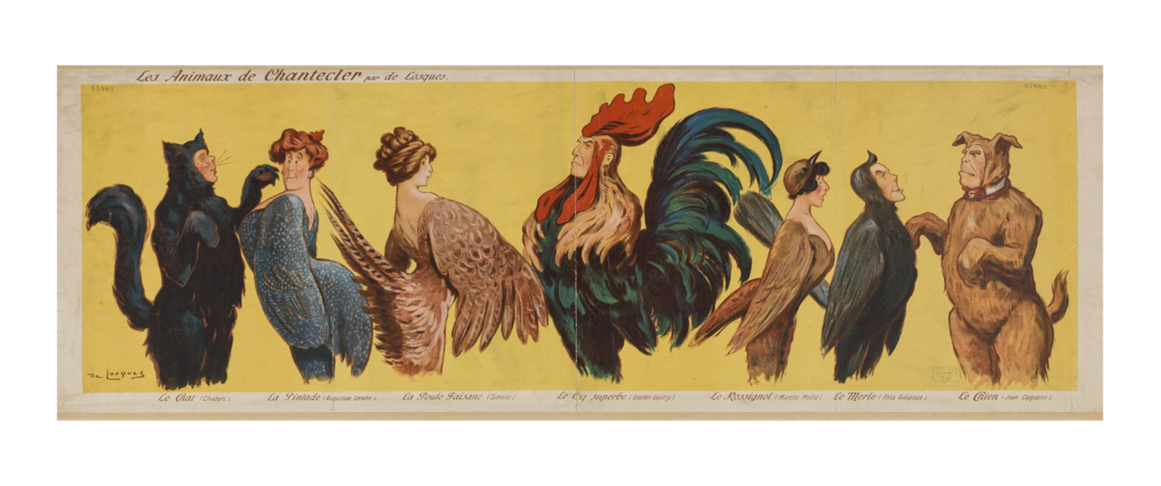 Les personnages de la pièce de Rostand, Chantecler 1910. Poulet, hibou, chien et peacock costumes sont présentés ici en détail. Lucien Guitry est représentée dans le costume, le coq avec Galipaux comme le merle en face de lui. Date : 1910 -