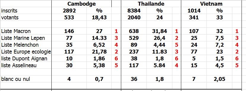 Les français d'Asie se sont déplacés avec mesure pour aller voter, 18% de votants au Cambodge contre 40 % en Birmanie. Singapour et Chine-Shanghai ont votes pour la liste de Macron a 54%. Ce sont principalement des exiles fiscaux a Singapour et des entrepreneurs en Chine, a mon avis c'est une erreur de calcul, Macron c'est le désordre social assuré et après avoir nettoyé les poches de la classe moyenne il va s attaquer la il y a de l'argent : les proprietaires a haut revenus !
