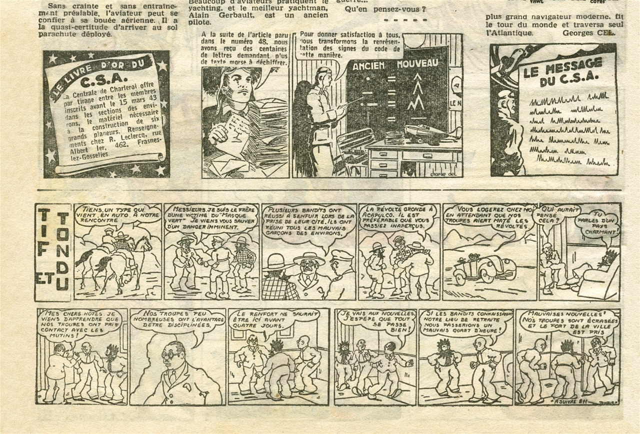 Le journal SPIROU 1943 paraissait pendant la guerre malgré la pénurie de papier .Alors que Tintin ne sortait que dans le quotidien Le Soir , une seule cartouche de quelques images tous les jours.