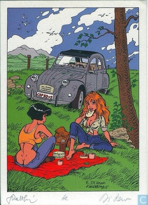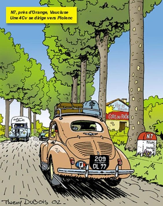 Les 404 avec leur caravanes Sterckeman , les 403, 204, tiens une traction , une 4cv avec tout le matériel de camping dedans, un paysan qui sillonne son champ avec son cheval ? Envie-t-il les vacanciers ? Mon Dieu non, il ne s'est pas posé la question , y a les bêtes et faut les nourrir tous les jours, sa cigarette roulée est collée à ses lèvres et s'agite comme une canne à pêche. Une famille new-yorkaise avec leur Chrysler autour d'une carte Michelin anonant des noms de patelins.Un jeune couple résident au bord de la nationale, a force de voir les voitures défiler sous son nez elle se verrait bien descendre dans le midi, mais ça coûte cher. Des intelos qui descendent en vélo, tous les acteurs de la fin des années '60 sont là.