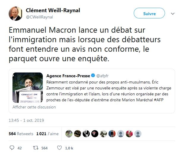 Un communiqué de la Société des Journalistes du quotidien demande à sa rédaction de “mettre un terme à cette situation ambiguë”, ce lundi 30 septembre. Une fois n'est pas coutume, les propos d'Eric Zemmour lui valent un torrent de critiques, de réactions indignées. Et peut-être même de sanctions. Ce lundi 30 septembre, après le discours qu'a tenu le polémiste à la Convention de la droite, la SDJ des journalistes du Figaro en appelle à la rédaction du journal. « Tous nos problèmes sont aggravés par l’immigration » « La SDJ s’interroge sur la position [d'Eric Zemmour], fort commode, de rentier de la polémique qui est la sienne : salarié du Figaro, il se lâche à l’extérieur sans retenue, arguant du fait que cela ne regarde pas ses employeurs et collègues de travail », écrit le syndicat. Et de poursuivre : « Les journalistes du Figaro, dans leur immense majorité, ne veulent pas être associés à ses provocations. La SDJ demande instamment à la direction de la rédaction de mettre un terme à cette situation ambiguë. »