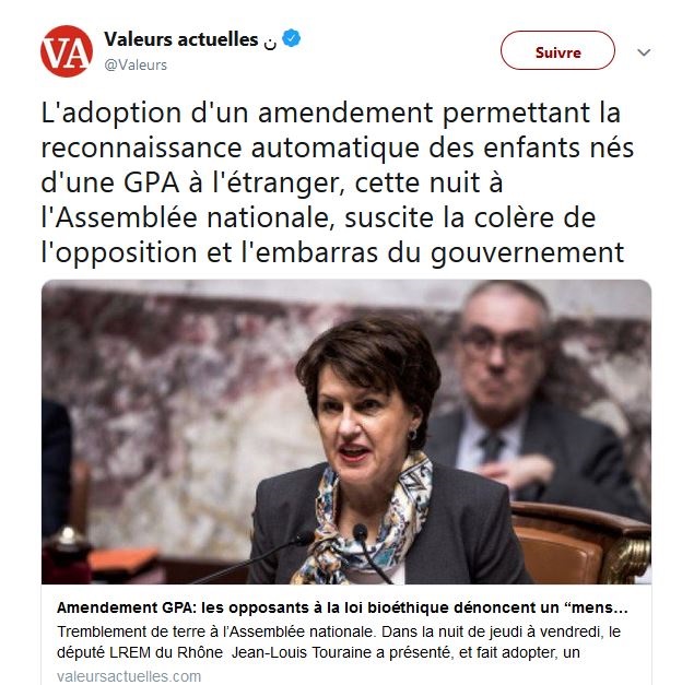 Nos maîtres ont décidés depuis plus de 10 ans de nous faire adopter par nos députés à la chambre une loi alors que la majorité des français n' a pas demandé , on préfère le cas par cas plutot qu'une loi de plus, c'est ce qu'ils appelent" la marche du progrès ", "les autres pays le font, alors nous aussi " "un enfant peut se passer de père" a dit notre ministre de la santé, des arguments réchauffés , ils n'ont rien de sérieux à nous opposer, rien ne tient debout dans cette histoire, ils suivent la feuille de route dictée par nos maîtres c'est tout .