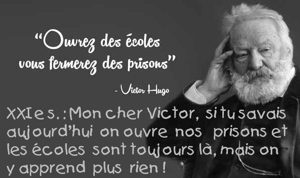 L'autre jour tu parlais d'ouvrir plus d"écoles pour fermer des prisons, l'idée est bonne en soi, pour ton siècle c'était cohérent , mais aujourd'hui c'est mort (excuse moi ), c'est incohérent et déplacé ! Même les instits' font des fautes de français, la discipline a disparue comme neige au soleil depuis une génération au moins, dans certains quartiers de France il y a 30 nationalités par classe, comment veux tu enseigner l'imparfait du subjonctif comme ça , ils parlent le croate, l'arabe ou le pachto à la maison ! plus personne n'y comprend rien, et aucun ministre n'ose prendre le taureau par les cornes de peur de se faire traiter de raciste et de perdre sa place, problème insoluble ! Un vent de libertés et de folies à soufflé sur notre pays depuis près de 50 ans et voilà le résultat .Certains buralistes dans la banlieue de Paris se font attaquer 30 fois dans l'année, histoire de leur piquer un peu de sous, les bijoutiers ont quittés la couronne de Paris, trop dangereux ! Et dans les classes ou il y a une majorité de français le programme scolaire est réduit en peau de chagrin , en gros ce que savait un petit français en ton temps en 1880 par exemple , aujourd'hui ils en savent à peine 10 pct !