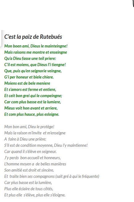 Poème de Rutebeuf, en vieux français avec adaptation a notre langue moderne : c'est la paix, poésie médiévale du XIIIe siècle