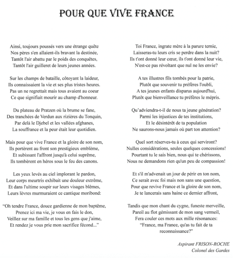 Mr Frison-Roche , je vous cite : "ceux qui sont aux manettes " ne peuvent pas comprendre ce que vous exprimez "mort pour la France" ils ne savent pas ce que ça veut dire, d'abord leur mandat est éphémère, votre fils comme vous êtes engagés à vie dans l'armée . Les politiques ont un plan de carrière et on les a placé là dans l’intérêt d'un homme ou d'un groupe d'hommes rassemblés dans un parti. Peu d'entre eux aiment la France comme votre fils l'aimait sans doute, nous sommes servit par une génération écoutant les sirènes des autres et souvent de nos ennemis mais pas françaises .