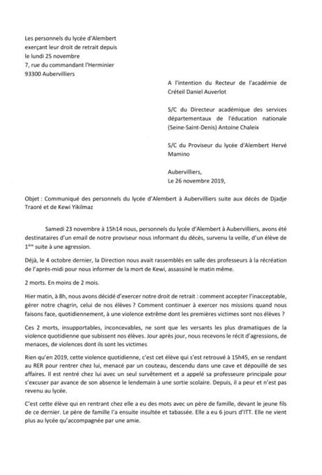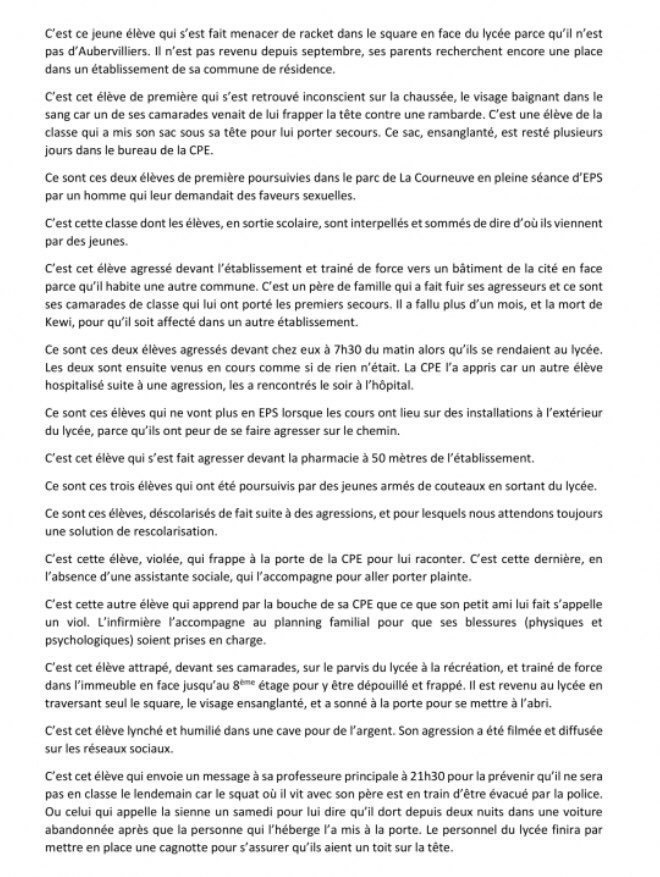 - l’intervention sur l’établissement d’un médiateur la rénovation des locaux. Nous portons ces revendications depuis plusieurs années auprès de notre Institution. Nous avons écrit des courriers, nous avons été reçus au Rectorat. En vain. Les élèves continuent de mourir. Ces drames ne sont pas des faits divers. Mis bout à bout, ils font système. Ne faut-il pas que l’Etat prenne ses responsabilités ?