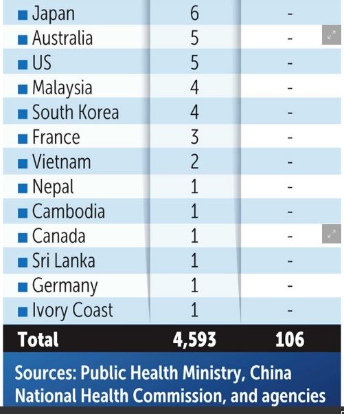 Chiffres clés au 29 janvier 2020 En Chine : 5994 cas confirmés, 132 décès - En France : 4 cas confirmés, aucun décès Les autres pays ayant signalé des cas : Thaïlande (14), Taïwan (8), Corée du Sud (8), Singapour (7), Malaisie (7), Japon (7), Australie (5), Etats-Unis (5), Allemagne (4), Canada (3), Vietnam (2), Népal (1), Cambodge (1), Sri Lanka (1) et Emirats Arabes Unis (1)