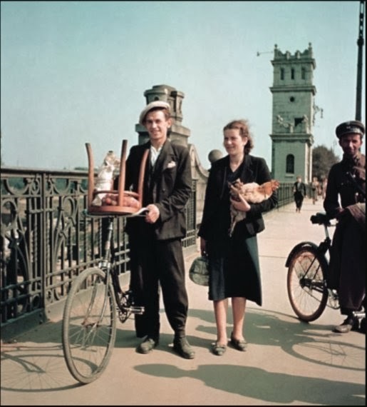 C'est très certainement un couple d'ouvriers ou d'employés . Cette scène est typiquement européenne , elle aurait pu se paser en France, en Allemagne ou en Belgique.La charmante dame qui pourrait être ma mère vient d'acheter une superbe poule vivante qui vient de passer une grande partie de sa vie dans une cour de ferme ou sur des chemins de terre . Son ancien propriétaire élève aussi des cochons, des vaches, des canards, des oies (pour les duvets) , des lapins (pour les peaux) et il a un lopin de terre de quoi nourrir a peu près 20 personnes . Il vit dans la grande couronne autour de Varsovie, il a pris sa voiture atelée pour faire 15 ou 20 kms ce matin . Le compagnon vient d'acquérir un tabouret de seconde main , certainement que le vendeur était un particulier qui bazardait quelques meubles après un déménagement.Il en a profité pour acheter une bouteille de vodka envelopppée dans une feuille de papier journal et 1 ou 2 kg de prunes .