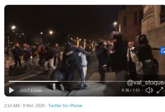 Valentin Stoquer @val_stoquer Interpellation d’une personne qui venait de casser un abribus. Des manifestants viennent aider la personne, s’en suit une violente altercation. #greve #giletsjaunes #bordeaux #Acte65 #greve8fevrier #grevegenerale