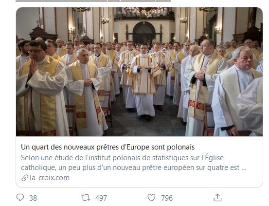 Patrick Edery @patrick_edery · 21h ✝️ 🇵🇱 1/4 des nouveaux prêtres en Europe sont polonais! Vous comprenez mieux pourquoi les progressistes détestent la Pologne? A chaque fois que les élites 🇪🇺 s'en prennent à la Pologne, c'est en fait aux racines chrétiennes de l'Europe qu'ils s'attaquent