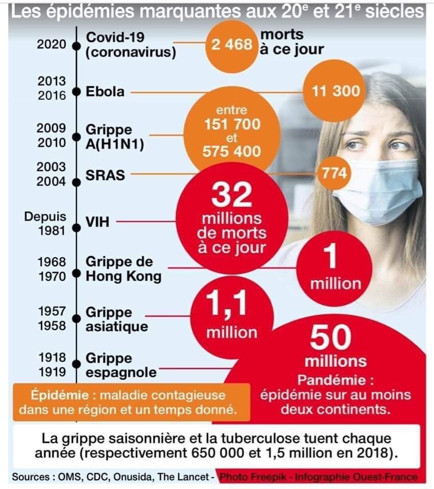 Avec un taux de mortalité de 2 a 4 % , en France a prés de 150 000 morts,l information ne galopait pas aussi vite qu aujourd’hui et une simple grippe a pu tuer autant de monde et plus de jeunes que de vieux.Faites le gros dos, laissez cette épidémie traverser votre ville, sans vous, n'y pensez pas , ne lui laissez aucun centimètre de votre corps, dites lui merde et circulez 'y a rien a voir, passez a autre chose , dans 1 mois l'orage sera passe.