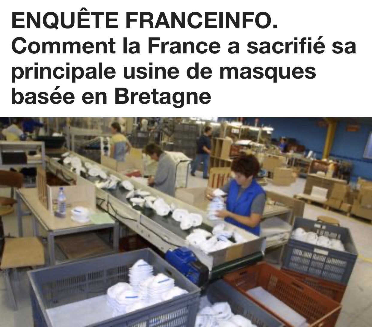 « c’est l’histoire d’une usine bretonne chargée de produire des centaines de millions de masques FFP2. Abandonnée par le gvt en 2018, ses machines ont été vendues au prix de la ferraille » 11:04 PM · 11 mai 2020·Twitter for iPhone