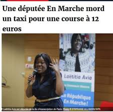 Je me fous qu'elle soit noire, verte ou jaune, mais Laetitia Avia ne m'inspire pas confiance,je me méfierai moi de quelqu'un qui pour manifester son mécontentement , mord. Elle a mordu l'épaule droite du chauffeur pour la bonne et simple raison que ce dernier avait le central carte bancaire en panne dans son taxi, il lui propose alors pour payer et de s'arrêter à un distributeur de billets, elle refuse catégoriquement , certes elle est baladée elle se met en colère et mord , ben voyons ! C'est tout naturel .