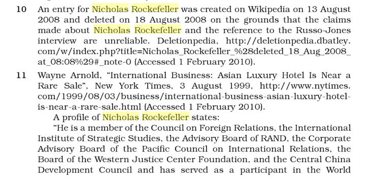 P..S : j'ai cherché dans Wikipédia les dates de naissance de Nicolas Rockefeller , rien dans la page "Rockefeller family" . La raison est est qu'il a été effacé de cette page suite aux allégations données par Aaron Russo en 2008 (voir texte ici bas).