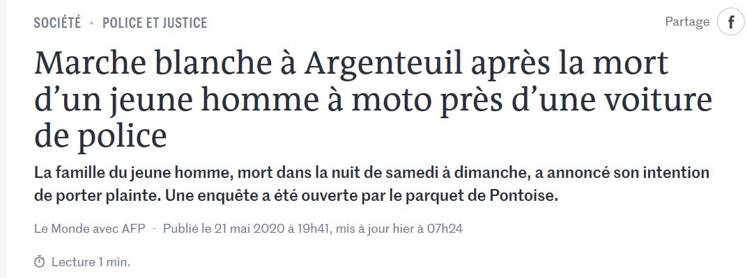 Plusieurs milliers de personnes ont participé à une marche blanche, jeudi 21 mai, à Argenteuil (Val-d’Oise) en mémoire de Sabri, jeune homme de 18 ans mort dans la nuit de samedi à dimanche dans un accident de moto, à proximité d’une voiture de police. Le cortège, où les jeunes étaient nombreux, est parti dans le calme de l’entrée de la cité Champagne pour rejoindre le lieu du drame, dans une rue d’un quartier pavillonnaire de la ville, a constaté l’AFP. Voir article journal LE MONDE du 21 mai .