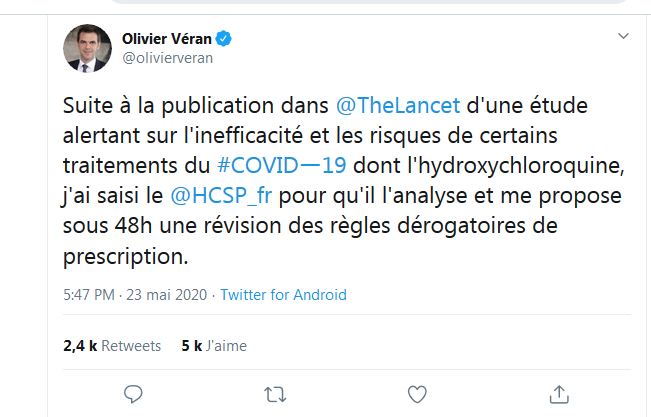 Au dela de la polemique il reste un point absolu. Moi meme medecin, je me suis constitué des stocks de HCQ et Azythro . Sans en dire trop, je vis a Manhattan et ai une autre propriete sur un "tres grand lac" du Midwest (merci la France de l’avoir decouvert). Ceci pour vous dire que le mot d’ordre des 2 gouverneurs a ete d’immediatement interdire l’HCQ. Imaginez cela. Meme mieux. La gouverneur a meme fait envoyer une lettre de menace aux medecins. Ca vous rappelle qq chose ? l’ordre des medecins en France a fait la meme chose. La meme stategie, mise au point mondialement, de faire le maximum de degats, medicalement et economiquement. Le message : faites vos reserves en douce pour "la prochaine". Bonne chance a tous. Si vous ne savez comment l’obtenir, achetez la en Inde sur internet.