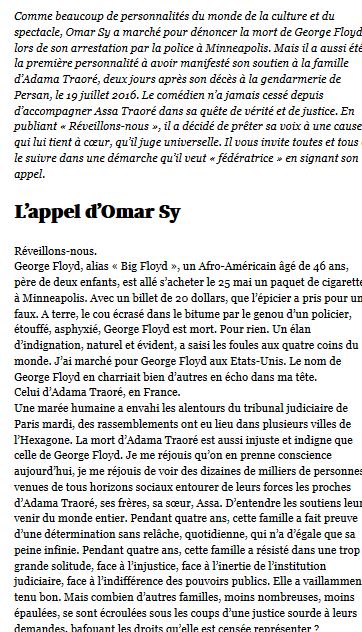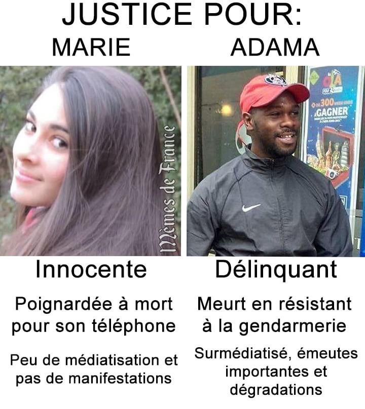 le ministre de l'intérieur est prêt à poser un genou à terre pour une famille dont sur 14 enfants (un père + 4 épouses) qui vit de rapines et de larcins il y a 6 délinquants violents et actifs , la mort d' Adama Traoré remonte à il y a 4 ans et on a rouvert le dossier 2 ou 3 fois et ce n'est pas terminé . ls sont dans la lumière blafarde des projecteurs tenus pas les médias , nos dirigeants sont soumis au dictat de l'antiracisme , c'est une religion .