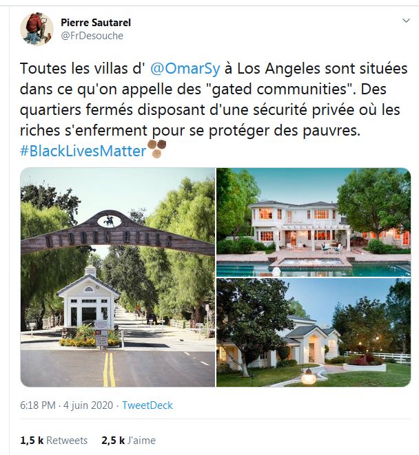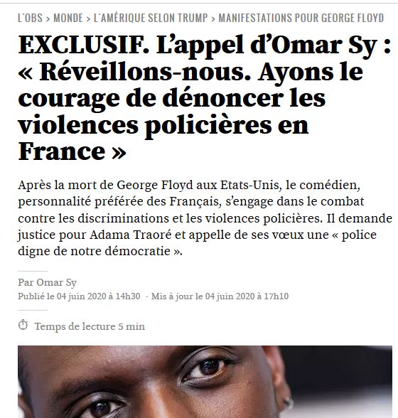 Omar Sy depuis qu'il gagne des sous vit à Los Angeles , mais il est le premier à nous donner des leçons d'antiracisme , certainement qu'il se trouve en harmonie avec les vedettes internationales d'Hollywood en somme ils sont à son juste niveau , et il manifeste volontier pour se montrer parmi ses coreligionnaires pour montrer qu'il reste un noir , qu''il se barre à Hollywood tant mieux pour lui,mais qu'il ne nous donne pas de leçons à 3 balles, franchement on l' a pas attendu. Mais hélas il n'est pas le seul à nous faire la morale, ils sont des centaines à nous dire comment il faut voter , surtout pas Marine Le Pen ou les Extrêmes, "surtout votez bien " qu'ils nous lancent , pour qu'ils puissent continuer à recevoir des gros budgets, des belles subventions et des contrats pour continuer leur propagande mondialiste.