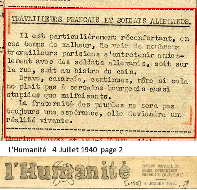 Avec le pacte Ribbentrop-Molotov, pas de vagues avec l'occupant allemand . Les chefs de cellules recevaient le mot d'ordre d'être les alliés des allemands et de sympathiser . C'était une directive complètement illusoire, car le militant de base était français avant tout et n'avait aucune envie de courtiser le boch, un gouffre les séparait.
