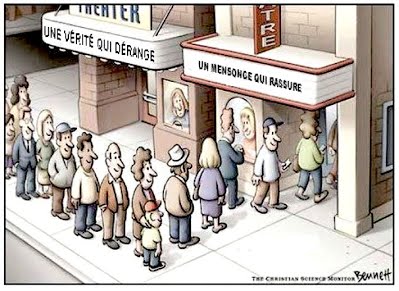 Et pourtant aujourd'hui beaucoup de nos amis se doutent qu'ils vivent dans le mensonge permanent de l' état relayé par nos journaux , ils préfèrent se bercer dans l'illusion du monde des bisounours , alors que ce n'est qu'un monde de marionnettes en représentation qui ne sont vivantes que parce que vous les regardez .