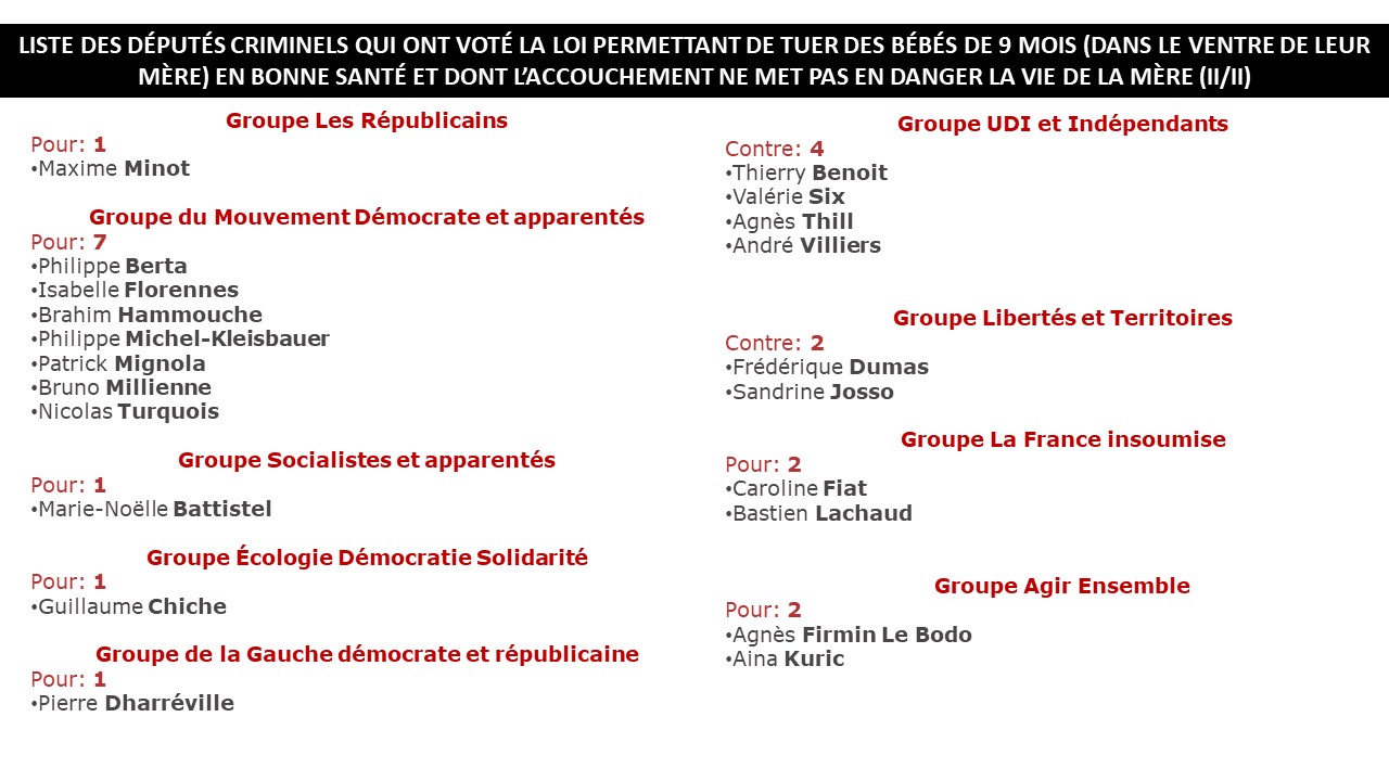 Patrick Edery @patrick_edery A faire passer: Liste des députés criminels qui ont voté la loi permettant de tuer des bébés de 9 mois, en bonne santé, dans le ventre de leur mère, alors que leur accouchement ne met pas en danger la vie de la mère. N'hésitez pas à leur écrire votre dégoût #OnNeLesOublieraPas