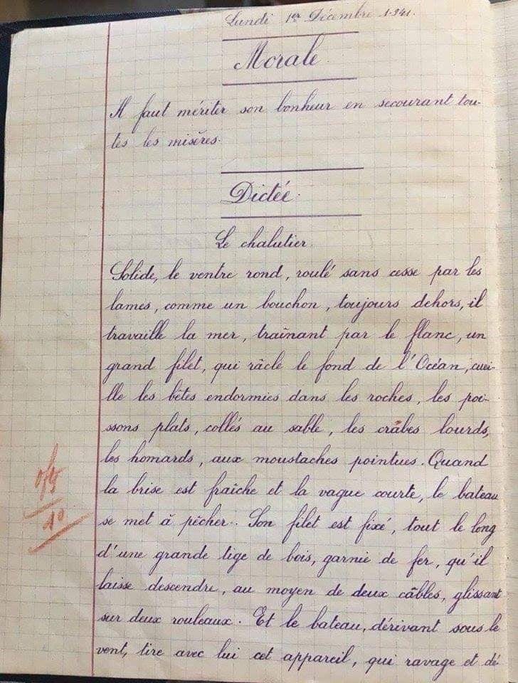 Tony Gavioli J’entends grincer d’ici les vieux dentiers... Une belle écriture est-elle le reflet d’une tête bien faite ? La majorité des écoliers maîtrisaient-ils tous les pleins et les déliés ? Doit-on souligner que cette page a donc été rédigée en 1941, année d’un XXe siècle à tout jamais marqué par deux guerres mondiales et un nombre incalculable de conflits coloniaux ? Est-ce que vous êtes en train de dire que mes enfants sont plus cons que cette génération-là ?