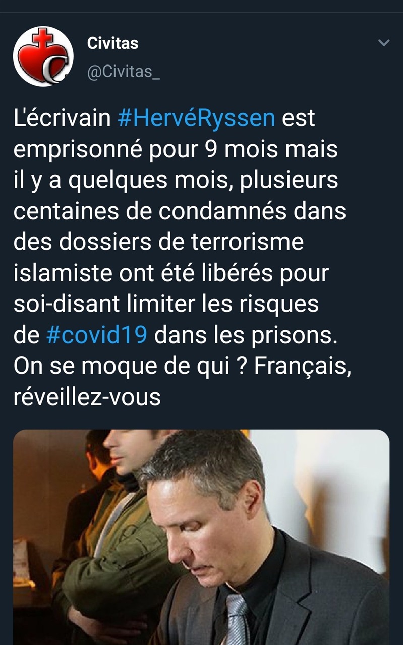 #2550989 Le 20 septembre à 21:57 par Ckamel Hervé Ryssen a été incarcéré Grâce à ER Lille, j’ ai assisté le 12 septembre, à une conférence de Monsieur Ryssen, ça me fait de la peine de le savoir en prison. Nous avons échangé sur les risques qu’ils prenaient, il les assume sereinement. C est un homme sage, fort et très agréable. Courage a lui et à ses proches. La période est à l’entraide de Hervé par le biais de courriers et envoi de timbres et aux dons ou achats à E.R et KontreKulture.