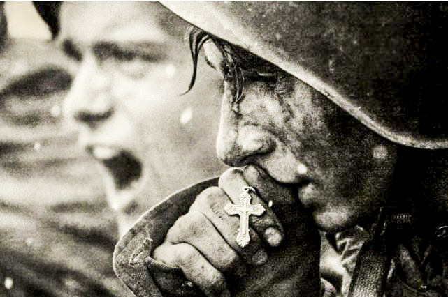 Ce jeune soldat rassemble toutes ses forces avant la bataille et prie.