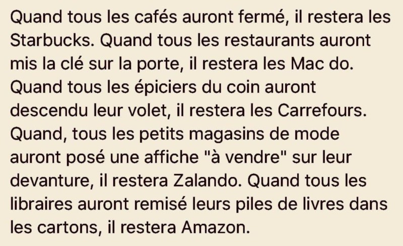 Ce reconfinement enrichit les Mulliez , Leclerc, Les Intermarchés et va mettre sur la paille les petits Duponts commerçants ....non il ne sera pas trop tard pour envoyer paître leur univers en toc et de rebâtir un monde nouveau sans eux .