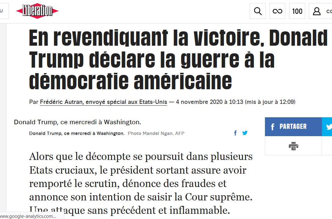 les Républicains dont les électeurs peuvent s'estimer orphelins de leur vote .Il y a les médias qui ont jouées un rôle néfaste dans cette tragédie , ils n'ont cessés de donner des faux sondages et de gonfler les chiffres en leur faveur, et que penser des chaînes CBS, NBC et FOX NEWS qui coupent le discours du président sortant au lendemain des élections, n'est-ce pas une réaction incroyable pour un pays qui se dit démocratique . Vous avez la preuve que les médias français sont totalement corrompus et n'ont cessés de traiter Trump de tous les noms pendant 4 ans et de le faire passer pour un psychopathe. Pourquoi 50 % des américains iraient voter pour un président irrationnel et surtout avec un fort tau de participation ? le tau est de 66.7 % pour 2020 alors que depuis 40 ans il oscille entre 45 et 60 %.