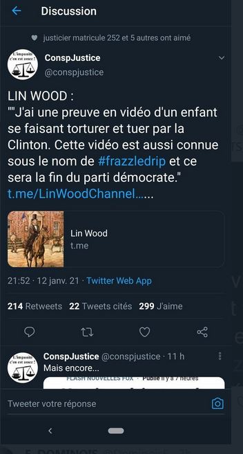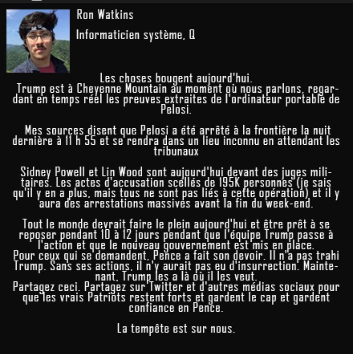 01h00 dimanche matin - BLONDEEL Jessy @BlondeelJessy · 43 min DUR TRES LOURD PELOSI ARRETEE J'ai du très lourd là Nancy Pelosi aurait été arrêtée 195000 arrestations de prévu Mike pence loyal envers Trump Source Ron Watkins sur "Parler"