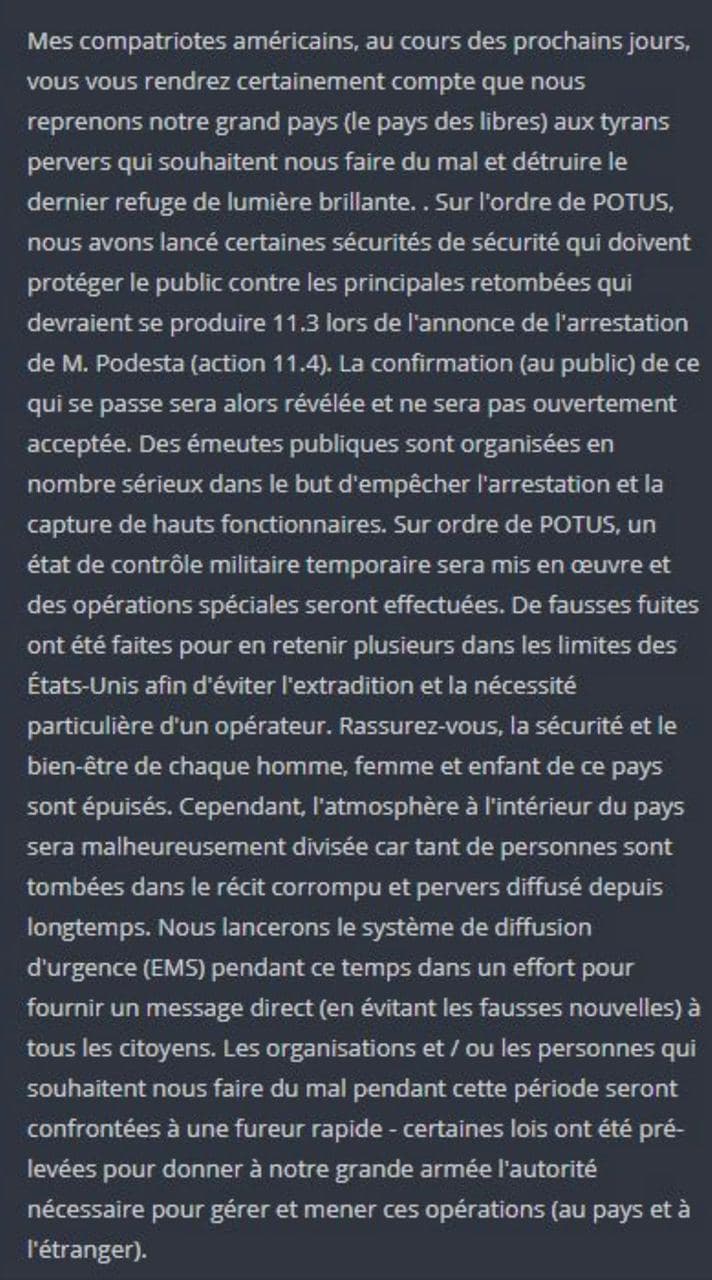 Robert Badin 1aatSfpod9onsore dh · CONFIRMATION du G. FLYNN et de LIN WOOD Le Général Flynn et Linn Wood, l'avocat du Président confirment bien le nouveau mandat de 4 ans de D. Trump et qu'il n'y par ailleurs aucun doute à ce sujet. Acte d'Insurrection Donald Trump a bien activé l'Acte d'Insurrection POTUS n'avait que très peu de temps pour l'activer car un coup d'Etat se prépare en ce moment contre lui aux USA (certainement prévu pour aujourd'hui ou demain.) De nombreux mouvements militaires inhabituels ont été filmés un peu partout sur le territoire américain. Selon Michael Jaco, l'Acte d'Insurrection a bien été activé et signé par le président ce qui veut dire que la Defense a reçu l'ordre de passer à l'action et des opérations sont en cours actuellement. Les Etats d'Unis sont en train de reprendre leur indépendance de façon pacifique et légale en conformité avec la constitution et le processus légal se mettra en oeuvre également en Europe. Il n'y a plus rien à faire maintenant qu'attendre et rester centré car tout va très bien et tout est sous contrôle... Il s'agit d'une action de justice légale. Les informations deviennent difficiles d'accès. Il y aura de nombreuses contradictions, c'est normal à ce stade de l'opération. Il y a aussi beaucoup de faux comptes, beaucoup de pages supprimés et il est maintenant préférable d'attendre patiemment que les choses se passent. Il est probable qu'il y ait des coupures provisoires d'internet et arrêts de certains réseaux comme facebook, Instagram, YouTube, Google... Parler vient d'être fermé... Il ne sert plus à rien d'être dans la recherche d'informations à tout prix car tout devient sans dessus dessous, pour désorienter les gens en raison de la reprise de pouvoir de l'Alliance sur l'Etat Profond... Par ailleurs Il y a bien eu ingérence du Vatican dans les Elections américaine. C'est terminé, nous y sommes enfin! La libération arrive, tout est prêt pour l'opération. Il faut encore patienter un peu mais ne pas douter car tout se passe bien selon le plan. C'est enfin le bout du tunnel... Tout va pour le mieux Gardons la ligne, restons optimiste et soyons confiants au plan... N'oublions pas que La Lumière l'a déjà emporté!