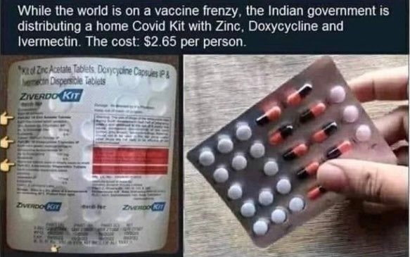 mtess Drapeau de la Suisse Drapeau de la Grèce 🇲🇫 Tête de cochon @OlafPeace · 18h Pendant que le monde occidental contrôlé par les mondialistes s'agite dans une frénésie vaccinatoire, le gouvernement indien distribue un kit familial contenant : Du zinc de la doxycycline de l'ivermectine. Le coût : 2,65 $ par personne.