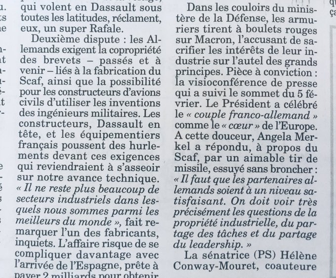 Florian Philippot @f_philippot Avion SCAF : les industriels français accusent Macron de « sacrifier les intérêts industriels français » au nom du « couple franco-allemand » (Canard enchaîné). Ils sont en train de réaliser que Macron n’est pas là pour servir la France mais la détruire ! Frexit/Macronexit vite !