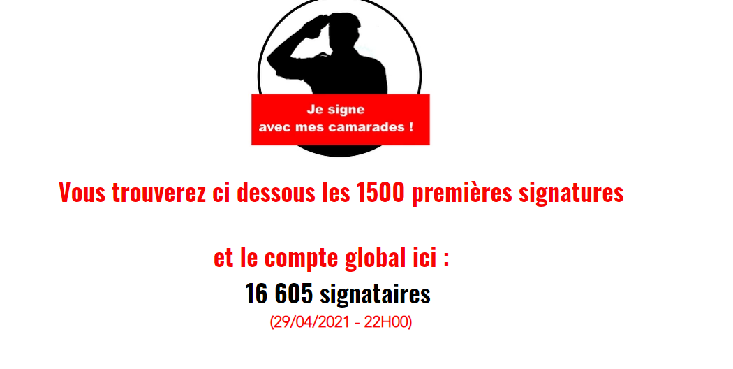 Les généraux signataires : Général de Corps d’Armée (ER) Christian PIQUEMAL (Légion Étrangère), général de Corps d’Armée (2S) Gilles BARRIE (Infanterie), général de Division (2S) François GAUBERT ancien Gouverneur militaire de Lille, général de Division (2S) Emmanuel de RICHOUFFTZ (Infanterie), général de Division (2S) Michel JOSLIN DE NORAY (Troupes de Marine), général de Brigade (2S) André COUSTOU (Infanterie), général de Brigade (2S) Philippe DESROUSSEAUX de MEDRANO (Train), général de Brigade Aérienne (2S) Antoine MARTINEZ (Armée de l’air), général de Brigade Aérienne (2S) Daniel GROSMAIRE (Armée de l’air), général de Brigade (2S) Robert JEANNEROD (Cavalerie), général de Brigade (2S) Pierre Dominique AIGUEPERSE (Infanterie), général de Brigade (2S) Roland DUBOIS (Transmissions), général de Brigade (2S) Dominique DELAWARDE (Infanterie), général de Brigade (2S) Jean Claude GROLIER (Artillerie), général de Brigade (2S) Norbert de CACQUERAY (Direction Générale de l’Armement), général de Brigade (2S) Roger PRIGENT (ALAT), général de Brigade (2S) Alfred LEBRETON (CAT), médecin Général (2S) Guy DURAND (Service de Santé des Armées), contre-amiral (2S) Gérard BALASTRE (Marine Nationale).